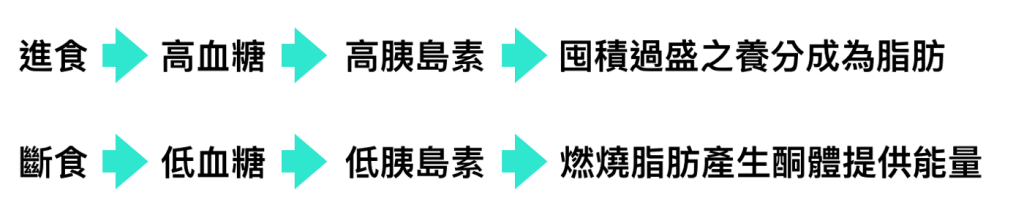 禁食(斷食)時 整個過程反過來 胰島素水平下降 身體開始燃燒能量 血糖下降 身體現在必須將肝醣取出來提供能量 它被分解成葡萄糖分子 給其他細胞提供能量 這可以為身體供約24-36小時的能量 下個階段身體會開始分解體脂肪 來獲取能量